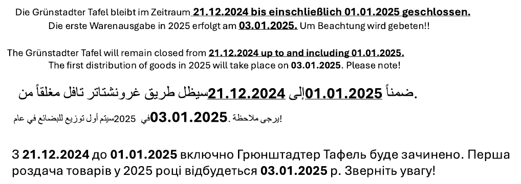 Am 03.Oktober 2025 bleibt die Tafel aufgrund des Feiertags geschlossen. Wir bitten um Beachtung.